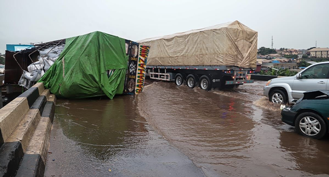 In their tweet at 8:40 am, LASTMA reported, “A fatal accident involving an overturned truck loaded with wheat has blocked a lane on Otedola Bridge en route to Ojodu Berger. Traffic is moving slowly, exacerbated by a flooded section on the bridge.”