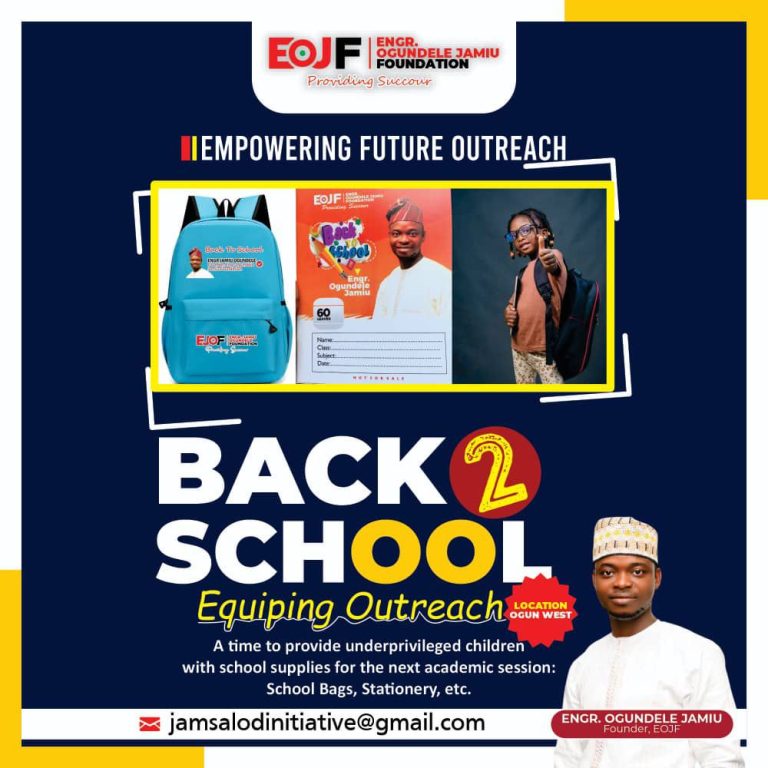 News Ogundele Jamiu Unveils Plans For September “Back To School Outreach” 8 months ago Readership As schools resume this September, Engr. (Amb.) Ogundele Jamiu, the visionary founder of the Engr….